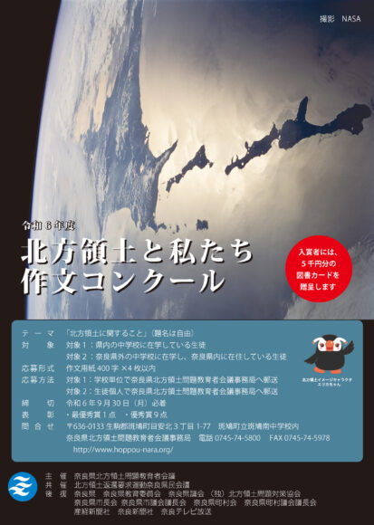 奈良県内の中学校に在籍又は奈良県内に在住の中学生が、北方領土の現実に関心を高めるとともに、北方領土が歴史的経緯や国際法に照らしても日本の固有の領土であることを正しく理解することを目的として実施。